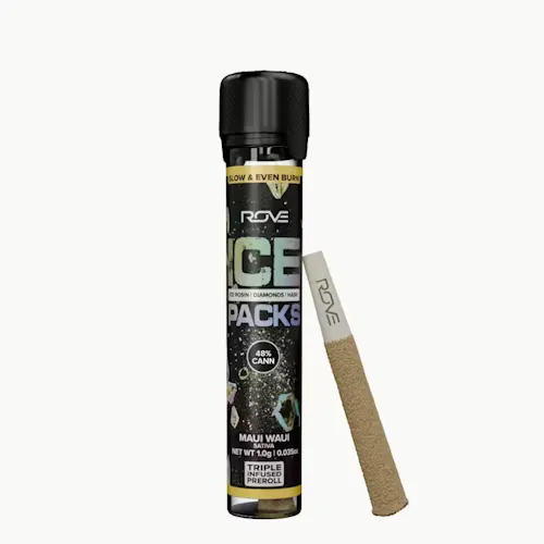 Rove 1G Ice Pack Preroll, the world’s first triple-infused preroll. Made with premium-grade flower fully-infused with THCA diamonds and solventless ice hash rosin
